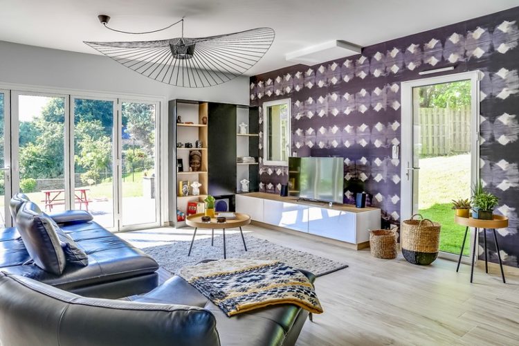 Le papier peint du salon a été rapidement validé, il donne énormément de caractère à la pièce. Le choix des meubles sur mesure avait été fait au préalable par mes clients, je suis intervenue sur le choix des matériaux, un mélange de laque et de bois, celui-ci venant réchauffer l’ensemble.